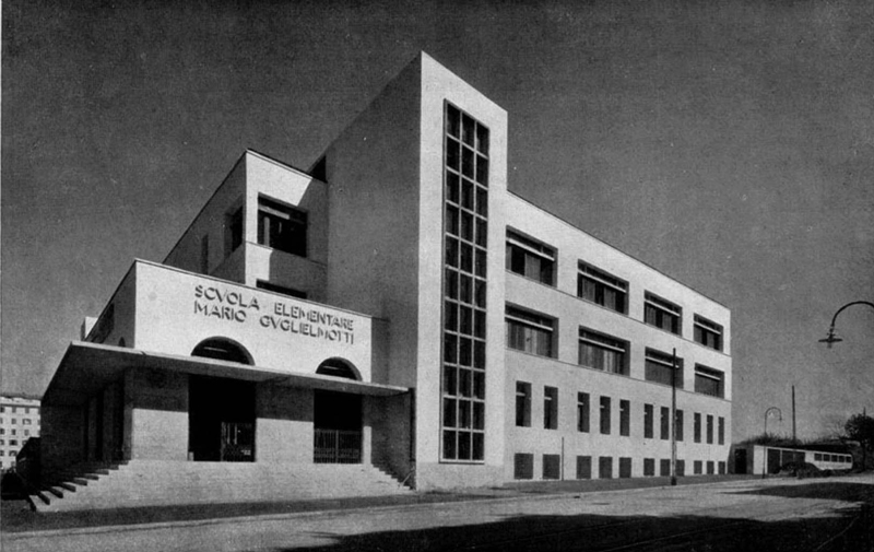 A representative project of other public buildings is the ‘Mario Guglielmotti’ School – today the ‘Alessandro Manzoni’ Elementary School – designed by Ignazio Guidi (another very valued architect and official of the Municipality of Rome) in 1932 in Via Vetulonia in the Appio-Latin district. The building, whose layout could not ignore a pre-existing building, is one of the first rationalist buildings built in Italy[4], remodeled in the 1950s with the addition of a floor. About this school Gaetano Minnucci wrote in 1933: «it is a school building of the Governorate of Rome; it rises a few steps from the monumental and severe Aurelian Walls, in sight of Porta Latina and not far from Porta Metronia; it is the first Italian school conceived from top to bottom from inside and outside, with criteria and with a new spirit, today. All this says that even the official technical and artistic bodies, the offices that, due to their function and atmosphere, seemed less ‘novecentizzabili’ [in line with Novecento Style] in Italy, have finally opened their windows to the pure air of the architecture of our time. […] All the classrooms are equipped with ventilation ducts with regulating valves; [...]» (Minnuci 1933, p. 23-35). The affirmations of Minnucci, one of the most skilled, refined and cultured designers of his generation, are testimony to the cultural climate of those same years.