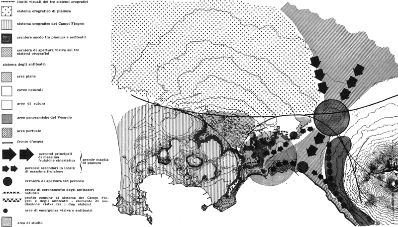 Una data molto importante per lo sviluppo storico e tematico della questione è quella del 1963-64, anno della tesi di laurea di Salvatore Bisogni e Agostino Renna appunto titolata Introduzioni ai problemi di disegno urbano dell’area napoletana[4]. Non è un caso che tale punto di svolta avviene proprio a Napoli, un territorio in cui le emergenze naturali, in primis quella del Vesuvio da sempre punto di riferimento fisico e simbolico dell’ambiente partenopeo, si impongono con notevole impatto formale ed evocativo.