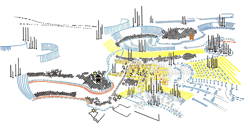 Il temine Disegno assume qui infatti il doppio significato di strumento e di composizione; è sia mezzo di rappresentazione che oggetto della rappresentazione stessa. Ciò è importante per cogliere che il tema del lavoro di Bisogni e Renna sia duplice, poiché indaga nella sua interezza la questione progettuale della grande scala ma anche i problemi relativi alla sua rappresentazione. «L’insieme dei loro disegni, sospesi in una produttiva ambiguità tra immagine simbolica e proiezione obbiettiva, è […] capace di restituire tutta la complessità materica, geografica, tipologica e storica di un insieme urbano e territoriale», scrive infatti Vittorio Gregotti (1974, p. 7). All’inizio si è operato in modo consueto, affermano Bisogni e Renna, servendosi di disegni planimetrici per rappresentare le organizzazioni dell’area; poi, attraverso diagrammi e viste a volo d’uccello (Figg. 1, 2), «figura il tentativo di sostituire a dirette annotazioni di tipo realistico dei simboli tendenti a rappresentare relazioni tra forme più che forme» (1966, p. 129). La rappresentazione del territorio fino ad allora limitata ad una visione urbanistica viene definitivamente superata da una un disegno capare di illustrare in maniera autografa e interpretativa quanto analizzato ma anche quanto desunto e proposto: vengono trasportate sul piano del simbolismo e dell’evocazione formale le immagini delle forme concrete, mettendo in luce le relazioni formali fra queste attraverso l’approntamento di modelli espressivi (Fig. 3), elaborati sintetici ed evocativi in cui anche le suggestioni e le proprie interpretazioni sono tradotte in un disegno.