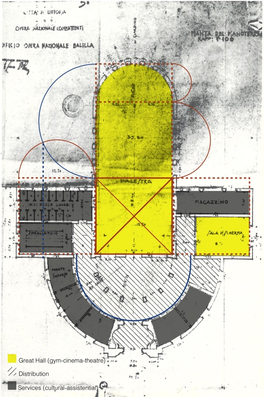 The building made for Littoria Scalo and Borgo San Donato is defined by a strongly symmetrical layout consisting of three autonomous blocks in which the original matrix becomes evident. The central body – anticipated by a portico – is the multipurpose hall hosting the activities of the Dopolavoro, such as the Cinema-Theater, the Dancing Room, the Gymnasium and the Assembly Hall. In the two side volumes are built the major rooms housing respectively the Post Office and the Casa del Fascio. Finally, the minor rooms connecting the two volumes are organised to host the service spaces. [Fig. 14].