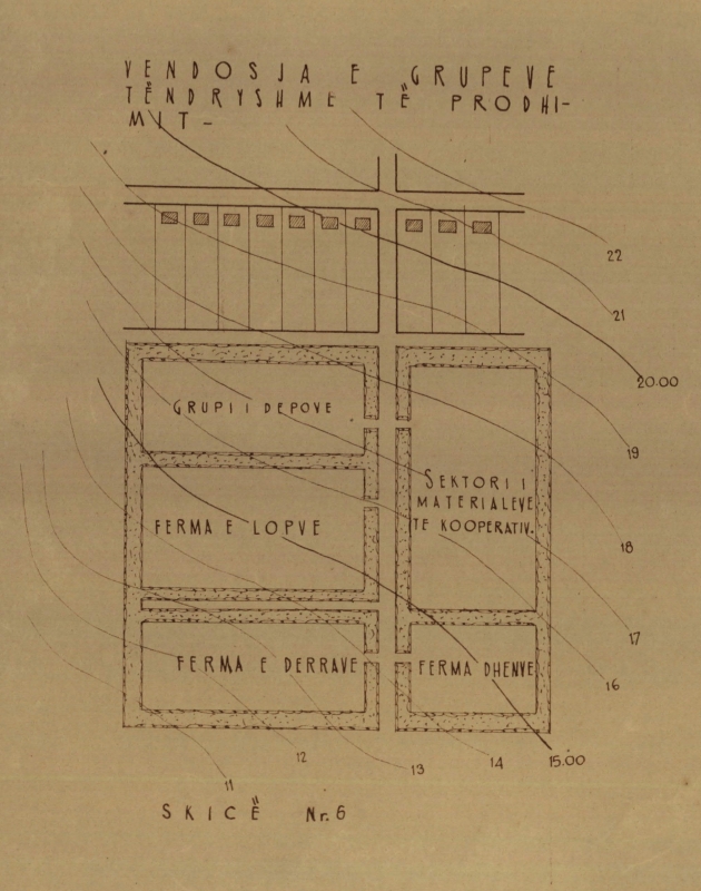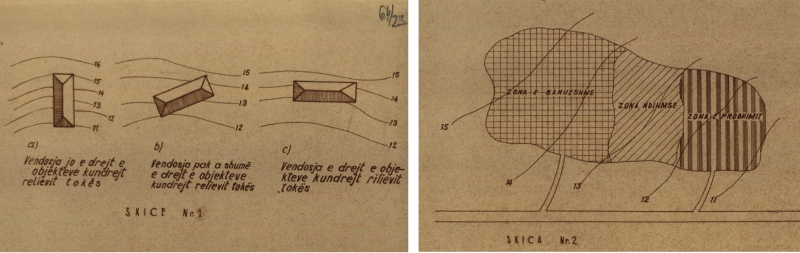 The functional zoning of the new socialist rural village was composed of the residential zone (zona e banimit) and the economic zone (zona ekonomike) that were arranged to form a grouped settlement. The schemes varied in relation to the orography of the terrain but also according to the distance with the national roads that, in turn, was pivotal in deciding the future urban development of the rural village.
