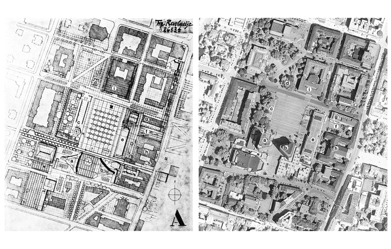 Già nel progetto presentato per il concorso, l’assetto del complesso ruotava attorno ad un grande vuoto centrale. Si trattava di un piano in cemento caratterizzato da un disegno geometrico di pavimentazione, che andava a configurare uno spazio compiuto, quasi un tappeto di misura monumentale contornato dagli edifici che ospitavano le massime autorità del tempo. Il giardino delle monache Orsoline era in effetti l’unico spazio urbano che poteva ospitare dimensionalmente questa espansione della città, ma se in una fase iniziale era necessario alludere ad una «funzionalità afunzionale» (Ravnikar 1974) per rispondere alle richieste del bando, nel corso del processo di elaborazione del progetto, il compito assunto dall’architetto è quello di trasformare uno spazio politico asettico in un luogo di vita, capace di mettere in relazione le nuove dimensioni della città.