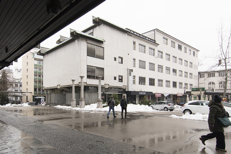 Ma è la realizzazione di un grande parcheggio completamente interrato che porta ad una variazione fondamentale: la piazza perde il suo perimetro definito dai parcheggi a raso in favore di un ambiente sociale unico e attraversabile, su più livelli. Tutti i suoi fronti sono accessibili superando dei lievi salti di quota. Scale, rampe e piccoli passaggi guidano il movimento attraverso lo spazio e una galleria urbana, luogo di vita metropolitana a misura d’uomo, accompagna al livello ipogeo l’andamento dell’edificio Emona. Ciò che prima era margine lineare, diventa così progressivamente «una cintura con opportunità di fare acquisti, di incontrarsi senza disturbo, di rilassarsi e di osservare; una cintura senza automobili, anche se sono vicine, una cintura polivalente con sorprese, aperta al vento e alla pioggia, al freddo e al caldo. In sintesi, si tratta di un esterno in cui incontriamo molte cose a cui siamo normalmente abituati in un interno» (Ravnikar 1974).