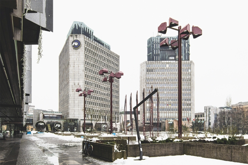 I basamenti, svuotati, rivelano la costruzione dell’edificio e si incastrano nei due podi di accesso alle torri. A est, la sede della Ljubljanska Banka (TR2) presenta nel suo volume inferiore lo stesso rivestimento in lastre di marmo, mentre a ovest, ai piedi della torre direzionale della compagnia Iskra, (TR3) viene utilizzato il mattone faccia a vista. Questa scelta è dettata dal fatto che si tratta di un’architettura che ospita una diversa funzione: la biblioteca tecnica dell’Università. Si separano dunque, linguisticamente oltre che funzionalmente, le destinazioni d’uso, mantenendo, seppur con materiali differenti, il medesimo carattere dinamico della pelle esterna.