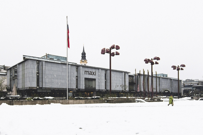 Il rapporto tra città storica e nuovo intervento si esplicita con chiarezza nella soluzione adottata per l’aggancio all’isolato barocco e nel Maximarket / Emona, edificio chiave per l’intero complesso. Il lungo parallelepipedo, accentuato orizzontalmente rispetto alla prima versione di concorso, contemporaneamente collega e delimita l’area del cortile dell’ex monastero (oggi piazza Plečnik) e la piattaforma di piazza della Rivoluzione. Si tratta di una delimitazione “dialettica”: l’edificio è in grado di relazionarsi con entrambi i vuoti, con entrambe le scale – sia con la piazza “barocca”, secondo misure praticamente preottocentesche, sia con quella moderna, monumentale. Il passaggio tra le due è rappresentato da un sottopassaggio, che unisce i due spazi, senza intaccarne le rispettive integrità.