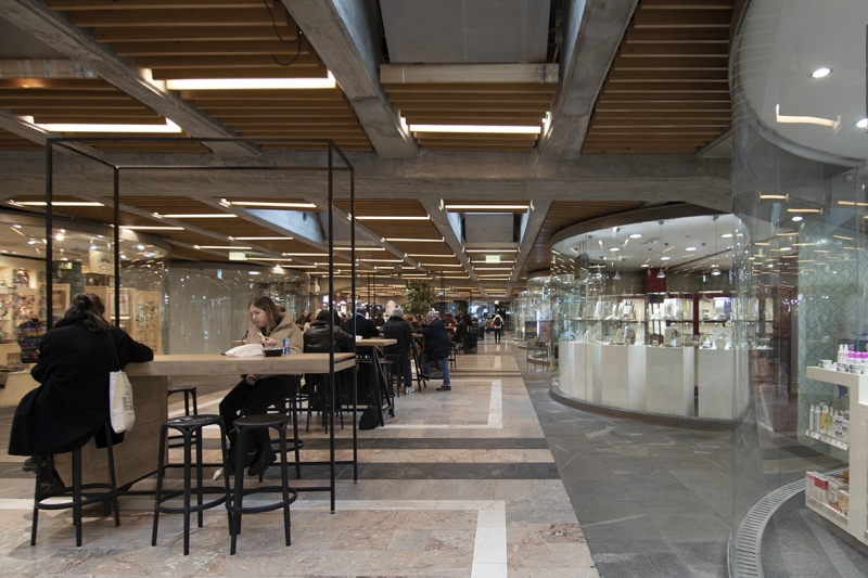 La lunga galleria commerciale termina in due spazi aperti: a nord uno spazio aperto con scalinata riporta al livello della piazza, mentre a sud si apre l’ingresso al foyer del Cankarjev Dom, in corrispondenza delle antiche mura romane.
