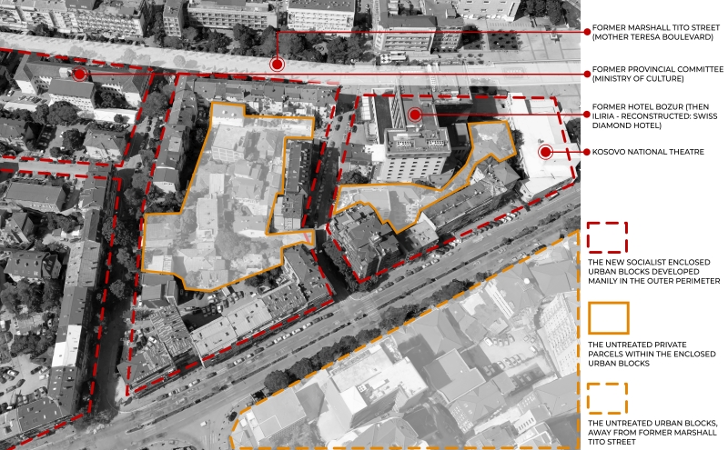 Pristina, prima della caduta dell'Impero Ottomano centro del Vilayet del Kosovo, era una delle capitali delle provincie dell'ex Jugoslavia. Una tipica città ottomana, con una struttura urbana compatta e un nucleo identificabile, il Vecchio Bazar. I quartieri erano equamente distribuiti intorno al Bazar e, come in altre città ottomane, mantenevano una evidente distinzione tra sfera pubblica e privata (Pasic 2004, p.7). Tra gli anni ‘40 e ’60, il Bazar fu raso al suolo dal regime socialista, lasciando il posto al nuovo centro città. Questo spazio simbolico è stato scelto per ospitare la scena della nuova rappresentanza jugoslava del Kosovo, attraverso Piazza della Fratellanza e dell'Unità, e due istituzioni statali su entrambi i lati: il Palazzo dell'Assemblea Municipale e l'edificio del Comitato Popolare Regionale per Kosovo (oggi Parlamento del Kosovo). L'urbanizzazione socialista di Pristina replica tali modelli nel resto della struttura urbana esistente.