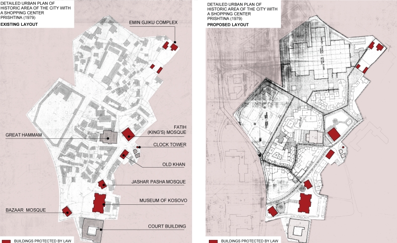 Un'altra vittima della «pianificazione retroattiva» è stato il Nucleo Storico. Il Piano Urbanistico Dettagliato (PUD) per il Centro Storico è stato approvato nel 1979, ovvero oltre 30 anni dopo la distruzione sistematica e pianificata del patrimonio edilizio urbano di Pristina. Sebbene in linea di principio il PUD avrebbe dovuto proteggere il patrimonio sopravvissuto, il suo obiettivo principale è stato la progettazione di un imponente edificio commerciale di 18.600 mq, che occupa circa il 60% dell'area totale pianificata di nuova costruzione. Questa sovrastruttura prevedeva di accorpare le botteghe che venivano costruite a est dell'Old Bazaar demolito, mentre stava cominciando una sua seconda vita, e il regime inseguiva anche questa. L'analisi spaziale rivela che il Piano mirava a preservare circa il 50% dell'area esistente, di cui l'8,6% era carreggiata, il 24,6% spazio verde e solo l'11,7% di strutture esistenti, che includevano una manciata di monumenti significativi.