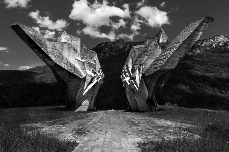 Spomenik is the word for “monument” in Serbo-Croatian language. It refers to memorial architecture and art altogether as the outcome of a civic resistance strategy to Nazi-Fascism linked to Tito’s government in Yugoslavia. He knew the need to project so many pluralities of different cultures and histories into an idea of a unified state. The result is countless signs and symbols made over about fifty years, hard to list in their entirety. This mosaic still overrides geographical, administrative, and cultural boundaries today in a time of new divisions. A high membership value was entrusted to the characters of civic art, conveyed through the plastic expressionism of form and scalar relationship without direct figurative and rhetorical connotations. Thus, it could dialogue with the landscape scale without renouncing possible evocative and poetic references. They are monolithic and assertive signs, shaped by the time of light and shadow, along with the display of the solid matter represented by concrete, typical of a brutalist expression. They are a sign of Yugoslavia’s modernity and differentiation within the world of “Soviet Realism” and indeed represent new constructive dialectics in the postwar Western debate beyond mute international rationalism.