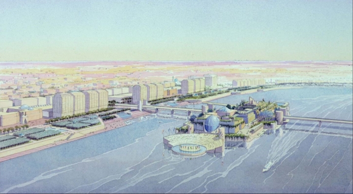 [9] It should be noted that the project has various and different references: from Iraqi pontoon bridges, to Isola Bella on Lago Maggiore, to Frank Lloyd Wright's plan for Greater Baghdad (1957), which included an artificial island in the Tigris riverbed: the island of Edena.