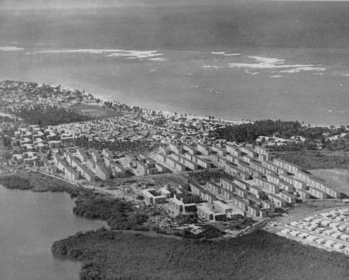 Ma già dagli anni Quaranta e Cinquanta erano presenti a Puerto Rico interventi residenziali ispirati alle Siedlungen del razionalismo tedesco, stecche residenziali a più piani e insediamenti di case individuali in quartieri suburbani (Fig. 4). Ciò si deve, in particolare, alla presenza di Walter Gropius e di José Luis Sert[3] presso la Harvard Graduate School of Design, una delle sedi universitarie più frequentate ancora oggi dai giovani dell’élite portoricana, al coinvolgimento di architetti come Richard Neutra nei progetti realizzati per l’isola, in particolare quindici edifici scolastici per attività didattica all’aperto, ed ai modelli insediativi promossi dai leader politici nominati alla guida del governo dell’isola (Rexfort G. Tugwell nominato da Roosevelt e Jesús T. Piñeiro da Truman) che indirizzarono le linee generali della crescita urbana.Fig. 4. Vista aerea. Luis Llorens Torres Public Housing Project. San Juan, Puerto Rico. 1950’s. Rafael Picó, Diez años de planificación en Puerto Rico, Junta de Planificación de Puerto Rico-1952.