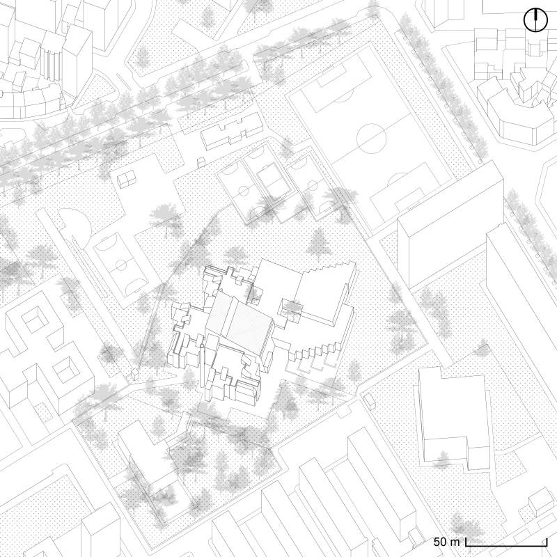 Una concezione simile dello spazio si ritrova nella scuola E10, pensata per riunire in un’unica struttura gli spazi necessari per l’attività scolastica e quelli da destinare alle attività sociali e sportive estese all’intero quartiere[19].