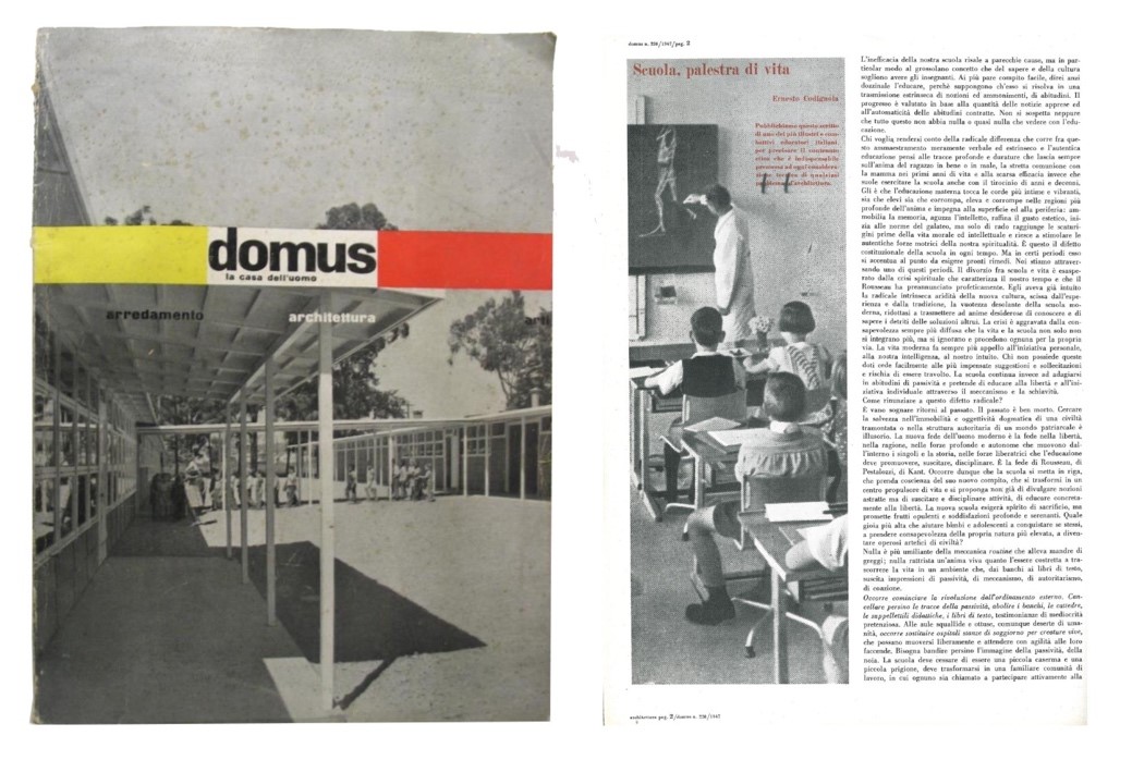 È facile immaginare che nel 1947 quando Ernesto Nathan Rogers invocò con forza – dalle pagine della rivista Domus (Rogers 1947a) – la necessità di una “architettura educatrice” come “sintesi tra i principi più progrediti dell'educazione e un'architettura parimenti evoluta”(Rogers 1947b), fosse in realtà ben consapevole della possibilità e allo stesso tempo della necessità – attraverso un numero dedicato «a un argomento d'architettura generale fuori da quello specifico della casa» (Idem), ovvero la Scuola – di proporre un manifesto concreto, politico e sociale, per suggerire all’Italia della ricostruzione una delle prime priorità a cui guardare per la ripartenza del Paese.