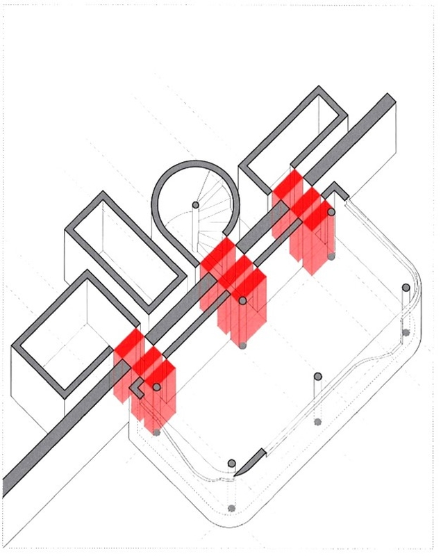 [10] Reference is made to the barn as a living area, the raised structure of the watchtower as a studio space and the bathroom located on the ground floor of the back tower.