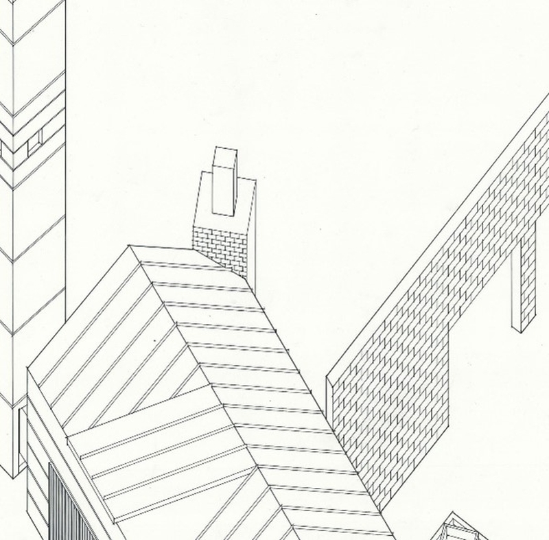 Moller’s drawing is the result of a short-term design studio, at the second professional year in Auckland. It lasted about three weeks, at the end of which there was a dedicated time for the preparation of the drawings to be submitted for the final crits. The studio brief did not seem to be particularly informed by theoretical issues on deconstruction that Mark Wigley was deeply investigating. As Moller himself recalls, «there were no seminars on Derrida’s philosophical thought to inspire our design proposals»[7]. It does confirm the main argument behind Wigley’s work, that is to problematize the relationship between architecture, representation, and deconstruction by resisting the superficial appropriation of concepts from other disciplines (bad borrowings) and the simplified translations from theory to practice (bad translations). In an attempt to reverse this relationship by stimulating the contribution of architecture to the powerful deconstructionist theoretical framework, students were required to put into action a collision between two architectures arbitrarily chosen by each of them, that is to say, by resorting to one’s own reference field inherent with the discipline as derived from one’s own innermost memories. The explication of the collision process in the final composition was entrusted to a specific representation technique: «each drawing had to be axonometric […] We weren’t allowed to draw in plan, or in section, let alone the perspectival sketches which were fairly dominant in the school at the time». The final draft was thus converted into a proper analytical device which aimed not simply at overcoming the experiential and perceptive approach rooted in the school. But it did so by purging the studio brief of all the information that would assimilate this experiment to a situated object in terms of construction, function, and place.