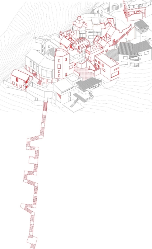 While the rapidographer’s geometric and sharp trait enhances the required analytical approach, the varied treatment scrupulously applied to the drawing’s textures betrays the author’s intention to convey a piece of information on the constructive aspects of the architectural fragments that participate in the axonometric composition. The size of the blocks is easily measured in the slanting wall and in the cubic elements inspired by Judd’s sculptures, as well as for the cross-hatching as applied to the cladding: «I was obviously aware of how to describe the New Zealand hay barn, and how to put all the constituents of its materiality on paper: light timber frame, metal cladding, wide openings and sliding doors often mounted on the outside […] I’m pretty sure that all this knowledge about construction wasn’t part of the studio. But it was definitely part of the two architectures I chose for the drawing, and of all the other fragments that compose it». This revelation sounds quite interesting when compared with a certain obsession with those constructive aspects typical of Kiwi architectural culture, which for Wigley had represented the greatest obstacle to the development of radical architectural thinking in the country (Wigley 1986; Barrie 2013). In this sense, function was also seen as a limiting attribute to the point of being neglected in the studio brief. The detail of the brick chimney scratching a corner of the hay barn, however, insinuates a sense of domesticity in the use of the space with the archetype of the barn suggesting alternative ways of living (Fig.7). Moller recalls that, although no function was initially established, «the final result is an inhabited space made up of three autonomous elements that define three different areas/functions»[10]. It must be said that, however generic, the act of declaring a residential function offered a contingent response to the New Zealand context, in the constant search for alternatives to the settlement model of detached-houses. This lively and rich debate dates back to the Group Architects’ manifesto (1949)[11], (Fig.8) later reinterpreted and radically applied by New Zealand architect Ian Athfield on the Wellington hills. Although it was not explicitly included in the reference field of Moller’s axonometric composition, the Athfield House-and-Office (1965) stimulated collective forms of living and working in a built complex made of pieces and parts as a result of an incremental process – still in progress – which explored the housing topic on a large-scale in a completely unprecedented way[12]. (Fig. 9) The large-scale is that of the landscape, the third element inextricably connected with New Zealand architectural culture and subtly insinuated into Moller’s axonometric composition through a nearly imperceptible detail. The analytical approach enhanced by a rigorous line drawing did not prevent the author from signalling the inclination of the lines that define the orderly disposed sequence of cubic elements. This simple gesture provide us with more information on the slope of the ground above which the composition is arranged, and its specific location (Fig. 10): «I well remember that those kind of architectural investigations weren’t site-specific. However, when I did my final submission that included this drawing, I did select a site». The composition suddenly becomes a situated object in the Chatham Islands, that is the easternmost point of New Zealand. Apart from the mostly uncontaminated hilly landscape that inspired the author’s choice, the geographical position is that of a place suspended in space, but especially in time, since a gap of 45 minutes on Aukland makes the Chatham Islands the first inhabited land to inaugurate a new day every day: «The Islands are, if you like, between New Zealand and the rest of the world. That was also the same principle according to which I positioned my proposal for Mark’s studio, namely between the New Zealand hay barn and the Judd’s sculptures, or the other fragments from my memory. I believe the same was true for the architectural theory discourse that informed this drawing, I mean, not necessarily a theory of New Zealand architecture, but a theory about architecture which embraced New Zealand for the first time».