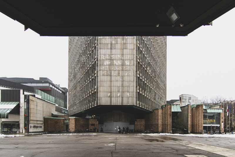 I basamenti, svuotati, rivelano la costruzione dell’edificio e si incastrano nei due podi di accesso alle torri. A est, la sede della Ljubljanska Banka (TR2) presenta nel suo volume inferiore lo stesso rivestimento in lastre di marmo, mentre a ovest, ai piedi della torre direzionale della compagnia Iskra, (TR3) viene utilizzato il mattone faccia a vista. Questa scelta è dettata dal fatto che si tratta di un’architettura che ospita una diversa funzione: la biblioteca tecnica dell’Università. Si separano dunque, linguisticamente oltre che funzionalmente, le destinazioni d’uso, mantenendo, seppur con materiali differenti, il medesimo carattere dinamico della pelle esterna.