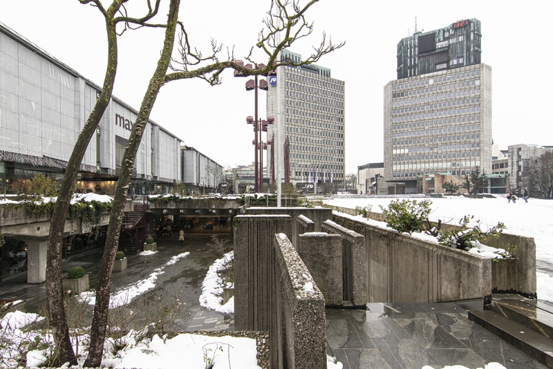 Ma è la realizzazione di un grande parcheggio completamente interrato che porta ad una variazione fondamentale: la piazza perde il suo perimetro definito dai parcheggi a raso in favore di un ambiente sociale unico e attraversabile, su più livelli. Tutti i suoi fronti sono accessibili superando dei lievi salti di quota. Scale, rampe e piccoli passaggi guidano il movimento attraverso lo spazio e una galleria urbana, luogo di vita metropolitana a misura d’uomo, accompagna al livello ipogeo l’andamento dell’edificio Emona. Ciò che prima era margine lineare, diventa così progressivamente «una cintura con opportunità di fare acquisti, di incontrarsi senza disturbo, di rilassarsi e di osservare; una cintura senza automobili, anche se sono vicine, una cintura polivalente con sorprese, aperta al vento e alla pioggia, al freddo e al caldo. In sintesi, si tratta di un esterno in cui incontriamo molte cose a cui siamo normalmente abituati in un interno» (Ravnikar 1974).