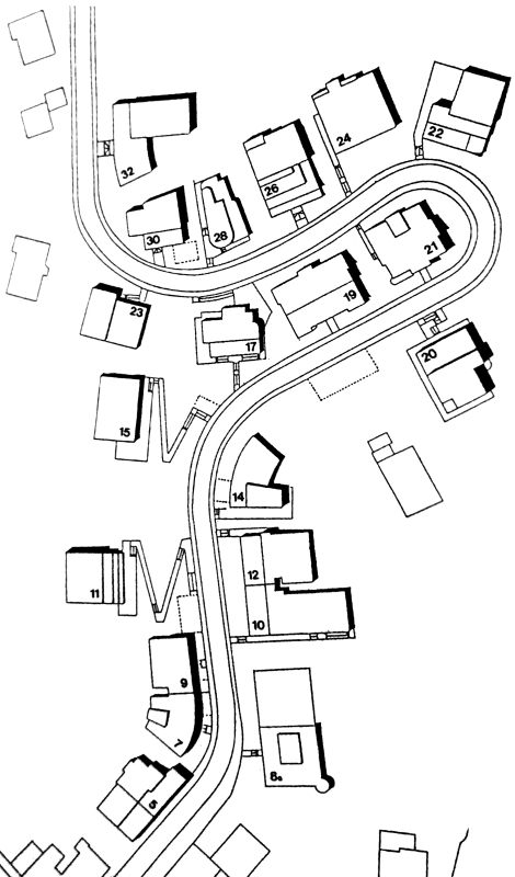 Lo stesso avviene in misura minore nella Casa 10 dove l'edificio termina in un angolo con un volume circolare a sbalzo con finestre a nastro e una terrazza al piano di sopra. La composizione complessiva è molto efficace e il risultato finale indica una capacità molto matura di combinare diversi volumi e geometrie e offrire una qualità dinamica. La Casa 32 è un semplice volume con una facciata curvilinea continua che segue l'ansa della strada. I diversi livelli presentano balconi lineari che offrono uno spazio di mediazione tra l'interno e l'esterno, offrendo visuali aperte offerte dalla posizione elevata della casa sulla sommità della collina. Tutti i progetti di Petrović mostrano una ricerca coerente verso modelli moderni, in qualche modo diversi da Villa Spitzer, mostrando così una diversità nel vocabolario architettonico degli edifici lungo la via Novakova, ma una coerenza piuttosto forte nell'affrontare i temi della modernità.